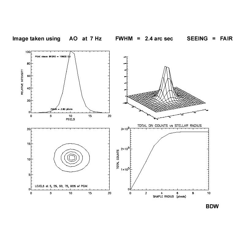 The improvement in stellar profiles can be seen at corrections above 1Hz. The upper picture on the right shows the non-AO guided image. And comparing the non-AO guided image to the AO guided image there is again significant improvement in the FWHM of the star profile (second picture on the right).