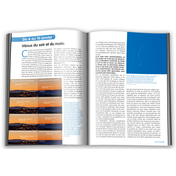Cette vingtième édition est truffée de récits d’observations et de conseils, saupoudrée de rappels mythologiques sur les constellations, épicée d’informations encyclopédiques sur les planètes et les étoiles et d’idées pour observer ou photographier facilement les plus beaux rendez-vous entre les planètes, le Soleil et la Lune visibles de janvier à décembre 2022.