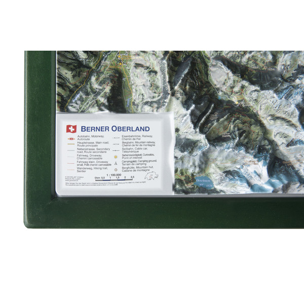 Mapa en relieve 3D real del Oberland bernés con sombreado en relieve y capas de altura en color derivadas de modelos del terreno de alta resolución. Se ha intentado reproducir gráficamente para el espectador el nivel de detalle de una fotografía aérea.