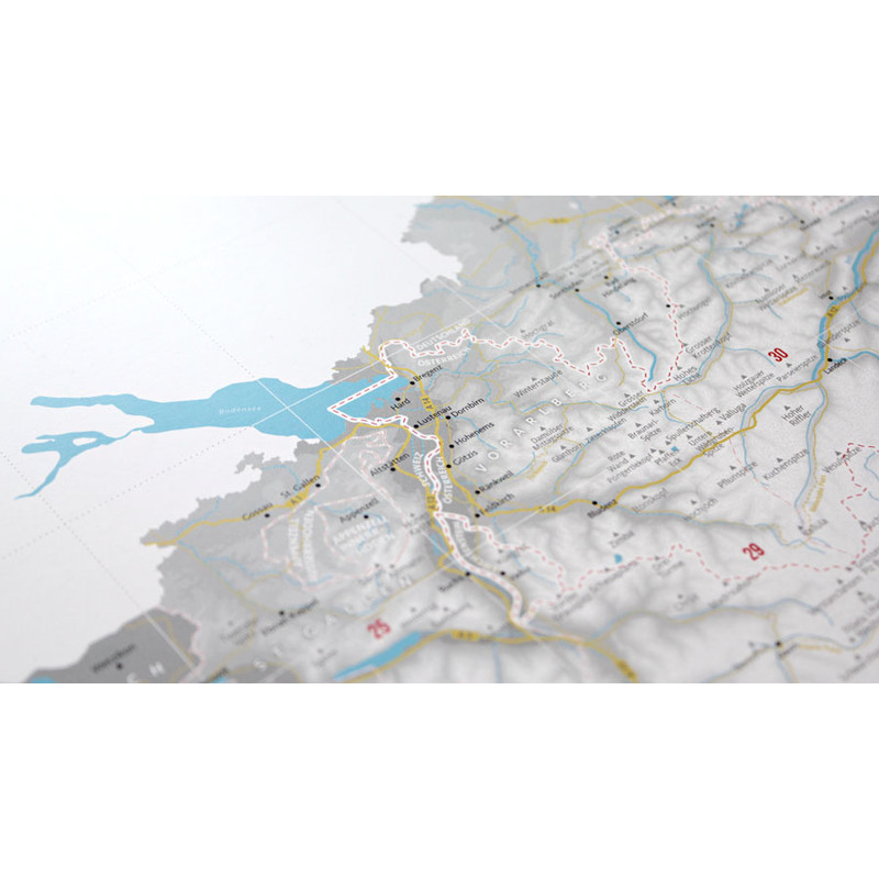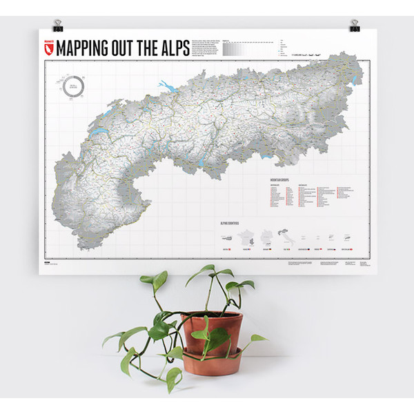 La estructura básica de nuestro mapa está formada por curvas de nivel con una separación de 250 metros. De este modo, el mapa tiene un aspecto plástico y reproduce bien la topografía de los Alpes. Además de las fronteras de los ocho países alpinos y sus regiones, se han marcado las carreteras, los puertos de montaña y los ríos más importantes, así como las ciudades y las montañas como puntos de referencia. En el mapa también están marcadas las fronteras de las regiones de cada país alpino. En el mapa están marcados y enumerados 63 grupos montañosos de los Alpes según la definición de Paul Zahn.
