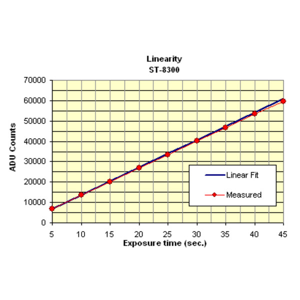 Linearity: Linearity is measure of how flat the CCD response is to light with increasing exposure times. For instance, an ideal CCD will record exactly twice the signal in a 20 second exposure as it does in a 10 second exposure from a constant light source. This is particularly important in photometric studies where the CCD is used as a tool for measuring light at various wavelengths to determine the temperature of stars. The sample we measured is about 10x better than Kodak's allowed specification, with a response that is within about 1% of linear (up to approximately 50,000 counts (binned 2x2).