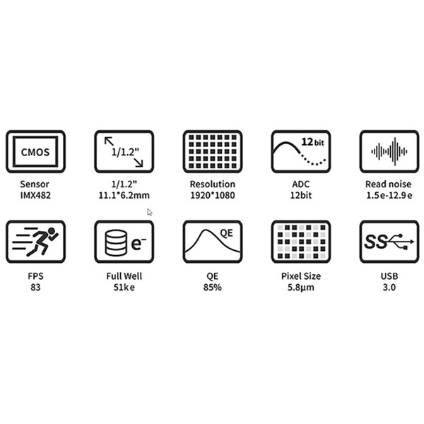 La ASI482MC es una cámara en color de última generación para fotografía lunar y planetaria. Con un tamaño de píxel de 5,8 µm, también es adecuada para telescopios con una relación focal de f/8 o inferior, como refractores de gran distancia focal, telescopios maksutov o RC, etc. Esta cámara sin refrigeración es una excelente forma de iniciarse en la astrofotografía. Su sensor, rápido pero bastante grande, ofrece buenos resultados al fotografiar cúmulos estelares, nebulosas y galaxias. Estos objetos del cielo profundo se fotografían en tan sólo unos segundos.