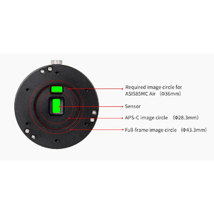 Requisitos del telescopio: Las cámaras ZWO Air son compatibles con telescopios que admiten formatos de imagen APS-C o superiores. Si se utiliza un telescopio con círculo de imagen APS-C, pueden producirse ligeras distorsiones en la estrella guía. Para un seguimiento más preciso y estable (autoguiado), recomendamos utilizar un telescopio con formato completo o un círculo de imagen mayor.