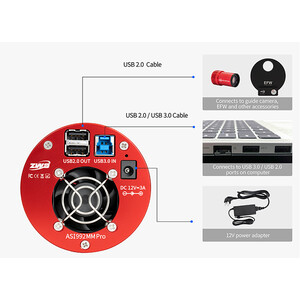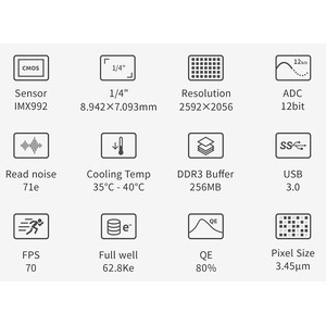 La ZWO ASI992MM Pro establece nuevos estándares en el ámbito SWIR: combina un sensor InGaAs especializado con alta sensibilidad en el rango de hasta aproximadamente 1,7 µm, una potente refrigeración de dos etapas, bajo ruido de lectura y almacenamiento de datos sólido.