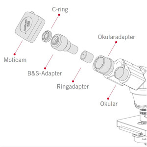 Simplemente fije el adaptador ocular a la Moticam, extraiga el ocular del microscopio y en su lugar coloque el conjunto Moticam-adaptador. Habrá convertido su microscopio convencional en un microscopio digital. Este adaptador especial (B&S) es opcional. Esta solución es también aplicable a microscopios de otras marcas