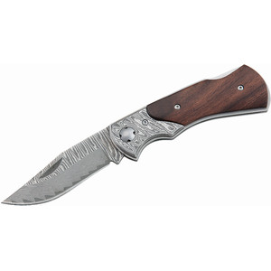 A special compilation, this pocket knife by connecting a 71-layered Damascus blade and the handle scales of beautifully grained wood. The pike blade is locked by a classic back lock. The handles are enclosed by jaws from 35-layer Damascus steel.