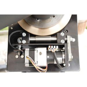 El diseño de la montura es el resultado del estudio de los más diversos tipos de monturas nuevas y antiguas, con sus ventajas y desventajas. Además de la precisión ya mencionada, debía tener una gran capacidad de carga y ser fácil de transportar. Esto último tuvo que pasar a un segundo plano en favor de la alta capacidad de carga. No es de extrañar, ya que para la montura se utiliza exclusivamente acero, que previamente recibe un recubrimiento en polvo de color como protección contra la corrosión. Esto tiene la ventaja, además de la gran resistencia y maleabilidad, de obtener una expansión uniforme. Es bien sabido que los diferentes materiales tienen distintos coeficientes de dilatación térmica y que, a diferentes temperaturas, pueden provocar una fricción innecesaria y, por lo tanto, dificultades de manejo. La montura, muy rígida y estable, tiene una alta amortiguación de vibraciones, lo que hace que la astrofotografía a largo plazo sea un juego de niños. Las ruedas helicoidales de bronce y los acoplamientos deslizantes de ajuste sensible permiten un posicionamiento y un seguimiento muy precisos mediante motores paso a paso y el control correspondiente.