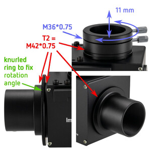 La pequeña caja negra contiene un espejo de desviación móvil que desvía el rayo en 90o hacia arriba o, en caso de necesidad, le permita el paso. Tiene la posibilidad de montar al mismo tiempo, tanto una cámara y un ocular. No tiene que realizar el enfoque complicado de una cámara CCD. Después de haber ajustado ocular y cámara puede realizar el enfoque dentro de pocos segundos.