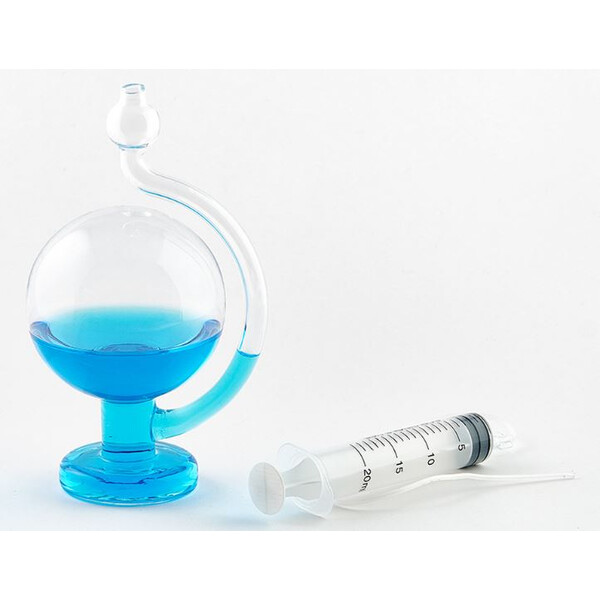 El barómetro de mesa de Goethe, también conocido como barómetro de vaso o barómetro de truena, consta de una esfera parcialmente llena de agua con un cuello que parte de la parte inferior, se eleva lateralmente y está abierto hacia la atmósfera.