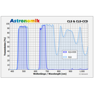 Este filtro es adecuado para fotografiar desde zonas con contaminación lumínica con cámaras sensibles al infrarrojo. Aumenta el contraste de todos los objetos del cielo profundo. Si la cámara ya dispone de un filtro IR, también puede utilizar los filtros CLS (sin el añadido «CCD») de Astronomik, algo más económicos.