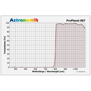 El filtro ProPlanet IR 807 corta la parte visible del espectro y solo se abre a partir de una longitud de onda de 807 nanómetros. De este modo, se bloquean las zonas de la luz que son especialmente sensibles a la visibilidad y se dejan pasar las zonas de la luz de onda más larga, que son mucho menos sensibles a la visibilidad. Este procedimiento reduce visiblemente los problemas de seeing en la fotografía planetaria y lunar, sin que ello suponga una pérdida significativa de sensibilidad por parte del sensor de imagen.