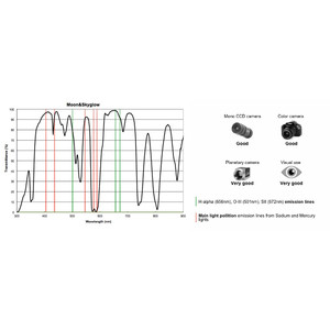 El ancho de banda característico del filtro realza especialmente los contrastes al observar planetas y la Luna. Las bandas de Júpiter o las estructuras de Marte destacan con mayor claridad. Al mismo tiempo, el fondo del cielo se oscurece, ya que el filtro bloquea los rangos de longitud de onda en los que la contaminación lumínica es especialmente elevada. Como resultado, los débiles objetos de cielo profundo emergen del fondo. Gracias a su mayor ancho de banda, el filtro "Luna y SkyGlow" también es adecuado para telescopios más pequeños en los que un filtro UHC restaría demasiada luz.