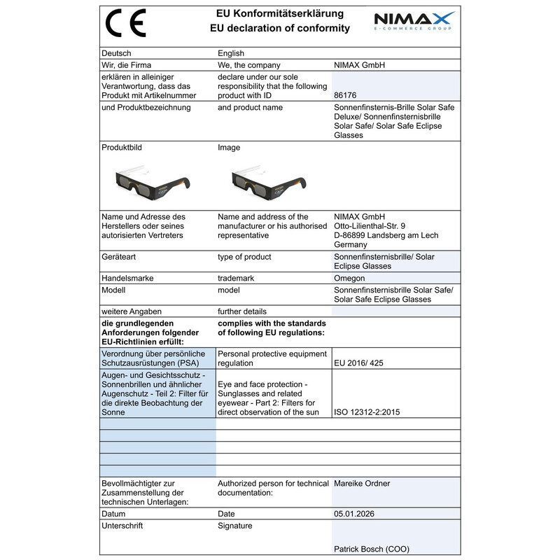 Observación solar > Filtros solares > Gafas para eclipses solares > Omegon > Omegon Gafas para eclipses solares Sonnenfinsternis-Brille Solar Safe