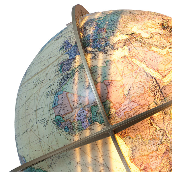 Iluminado, irradia una calidez especial con su armoniosa combinación de colores y subraya el carácter tradicional de los globos terráqueos equipados en consecuencia, mostrándole con detalle las zonas montañosas y las cordilleras de nuestro planeta.