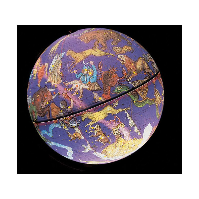 Este globo terráqueo muestra el cielo estrellado con las 88 constelaciones oficiales. Las constelaciones están representadas como figuras esquemáticas y con sus límites. Las estrellas están impresas en diferentes tamaños según su brillo.