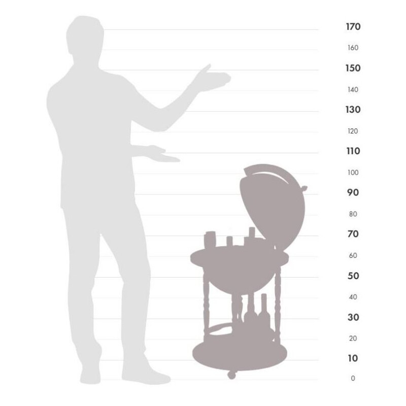En el estante inferior, decorado con colores naturales a base de agua, pueden almacenarse botellas adicionales. Además, el globo tiene unas bonitas patas de madera de nogal, a juego con el elegante diseño de la cartografía, y ruedas giratorias para moverlo fácilmente.