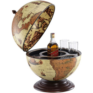 Este pequeño globo de mesa para minibar cuenta con un compartimento interior para 9 vasos y 2-3 botellas. La cartografía del mapa es una réplica del siglo XVI.