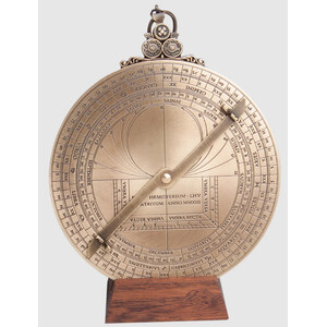 Este astrolabio planisférico se basa en una pieza original del fabricante alemán G. Hartmann, que se encuentra en el Museo Británico de Londres. Georg Hartmann o Georso von Gius Hartmann (Deutschland, 1489-1664) fue un auténtico hombre de la Renaissance. Se estableció en Núremberg a partir de 1518 y allí creó su enorme obra. Poco antes de 1523 ya había fundado un taller especializado en la fabricación de instrumentos científicos. Muchos de sus instrumentos se han conservado hasta nuestros días: los relojes de sol, astrolabios, cuadrantes, así como compendios astronómicos y astrológicos.