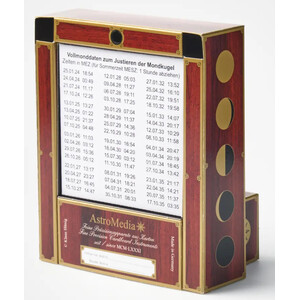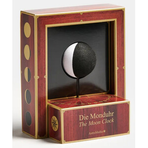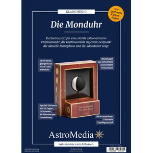 Aunque el reloj lunar de AstroMedia tiene sus antecedentes históricos en los grandes relojes astronómicos de la Edad Media, como reloj de pared y de mesa es probablemente el primero y único en todo el mundo que muestra el cambio de la fase lunar de esta manera. El montaje de este kit de cartón con mecanismo especial es sencillo y da rápidamente un resultado muy elegante.