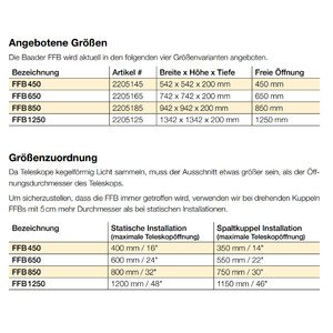 La FlatFieldBox (FFB) de Baader Planetario es la solución definitiva para crear flats perfectos en su observatorio, independientemente de las condiciones de luz exterior. Disponible en cuatro tamaños —450 mm, 650 mm, 850 mm y 1250 mm—, cubre una amplia gama de aperturas de telescopio. Esto permite un uso flexible para diferentes tipos de telescopios.