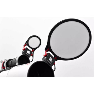 Una máscara de campo plano crea una superficie blanca con una luminosidad definida. Simplemente coloque la máscara sobre la óptica de su telescopio y fotografíe la superficie blanca. Esta toma, denominada «toma de campo plano», le permite registrar la distribución exacta de la luminosidad de su sistema óptico y corregir el gradiente de luminosidad de sus fotografías astronómicas durante el procesamiento de las imágenes.
