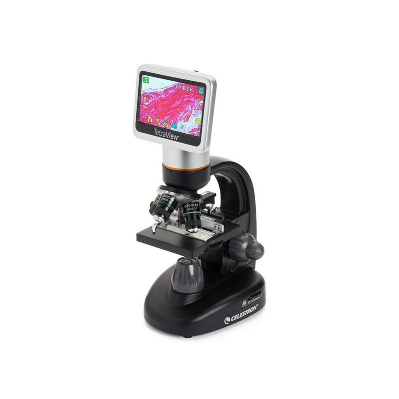 El microscopio digital LCD profesional TetraView de Celestron es un microscopio LCD asequible, de pantalla táctil y con características avanzadas. TetraView cuenta con cuatro objetivos totalmente acromáticos, una platina totalmente mecánica, una pantalla táctil TFT a todo color de 4,3", un sensor CMOS de 5 MP y una tarjeta SD de 2 GB para almacenar sus fotos y vídeos. Capturar imágenes y vídeos de alta resolución de sus muestras nunca ha sido tan fácil: la pantalla LCD gira 180° para que pueda compartir sus tomas con los demás. Para un público aún más amplio, utilice la salida de TV para mostrarlas en un televisor o proyector. Con un aumento de 40 a 400x (1600x con zoom digital), TetraView es estupendo para visualizar una serie de muestras celulares en portaobjetos. El microscopio TetraView es ideal, tanto para el profesional como el aficionado exigente. Es una herramienta estupenda en laboratorios, escuelas, centros investigación científica y otros.