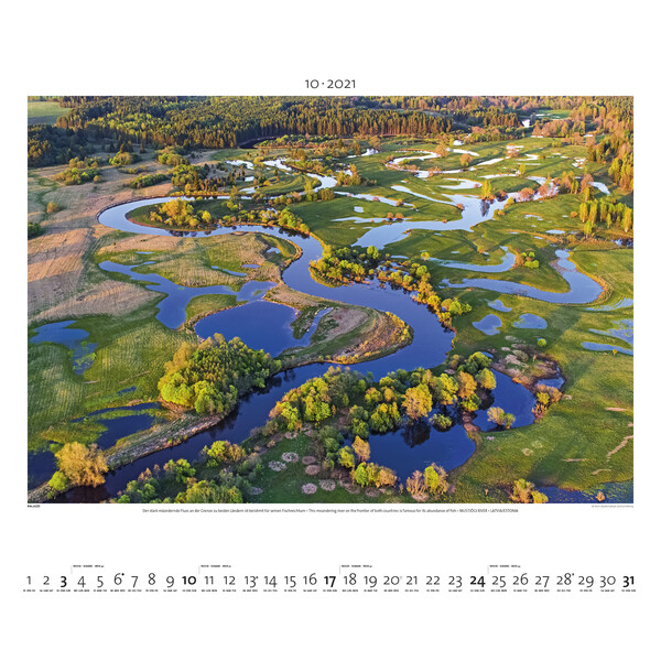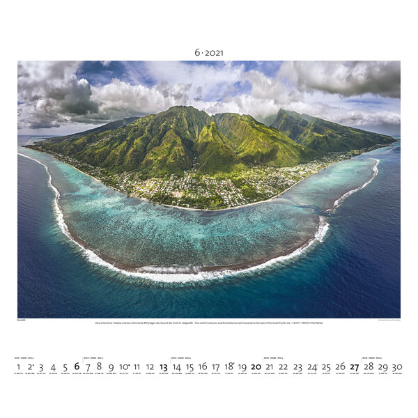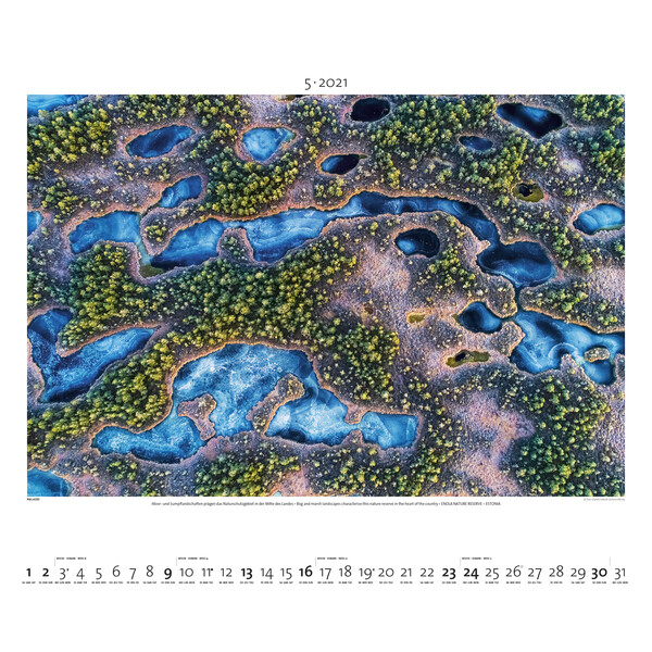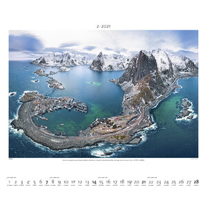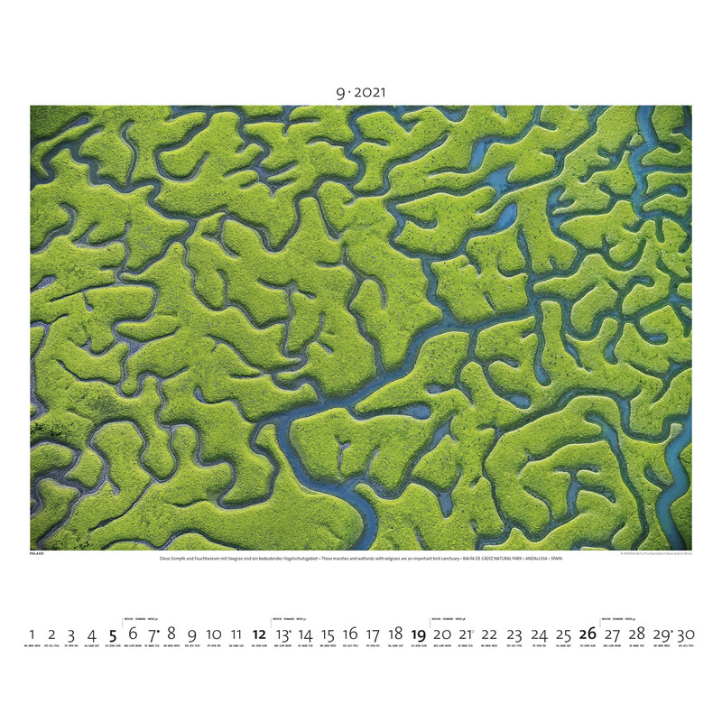 El generoso formato de este calendario de pared realza las 12 impresionantes fotografías aéreas. El calendario que aparece debajo tiene un diseño deliberadamente discreto para dejar mucho espacio a las imágenes.
