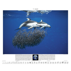 El generoso formato de este calendario de pared (60 x 50 cm) realza las 12 impresionantes fotografías de animales. El calendario que aparece debajo tiene un diseño deliberadamente discreto para dejar mucho espacio a las imágenes.