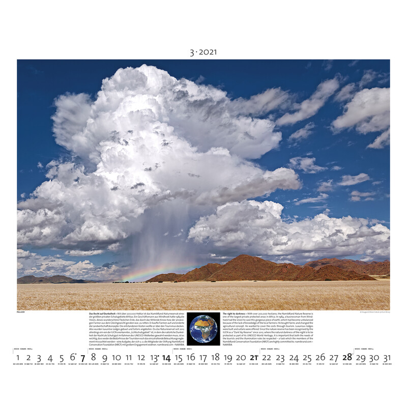 Estos impresionantes estudios paisajísticos y fascinantes fotografías de animales, realizados por fotógrafos de renombre de todo el mundo, muestran toda la belleza y diversidad de la Tierra. Un calendario que hace un llamamiento a la protección del planeta y que, en textos detallados, presenta también la importante labor de distintas organizaciones de protección de la naturaleza. Una declaración de amor al «planeta azul». Con textos informativos y ejemplos de proyectos de protección de la naturaleza.