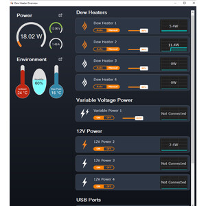 Además, el controlador proporciona cuatro salidas de 12 V DC para alimentar diversos dispositivos, como la montura, el motor de enfoque y la cámara. Uno de los puertos tiene un voltaje variable que se puede ajustar de 3 V a 12 V. La unidad de control también dispone de tres puertos USB.