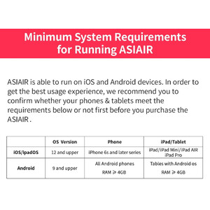 El ASIAIR Mini le permite controlar todas las cámaras ZWO ASI USB 3.0, ZWO ASI Mini y determinadas DSLR, así como cámaras sin espejo y casi todas las monturas habituales mediante un smartphone o una tableta.