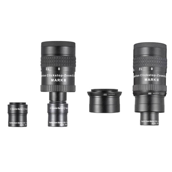 El ocular Mark III ClickStop Zoom 8 - 24 mm en combinación con la lente Hyperion Barlow 2,25x da como resultado el ocular zoom con el mayor rango de distancia focal de 3,5-24 mm. Incluye ocular de goma 43/44 con parasol abatible.
