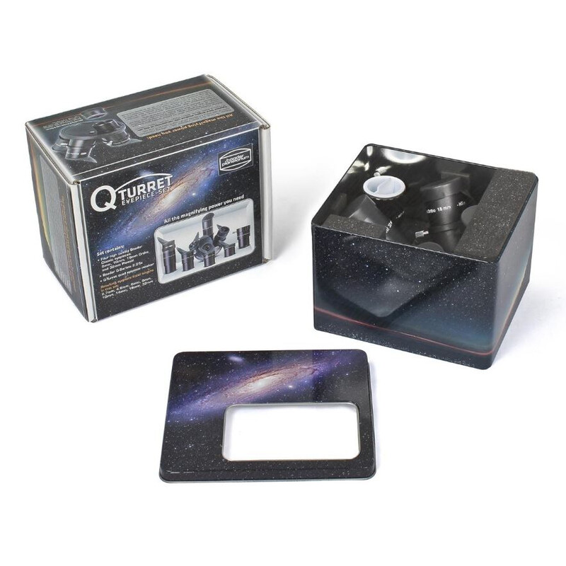 La lente Barlow se puede atornillar al revolver ocular Q-Turret o combinarse con todos los oculares de 1,25" mediante el adaptador especial incluido. De este modo, proporciona un factor de aumento de 2,25x. De este modo, el revólver de oculares Q-Turret ofrece las siguientes distancias focales: 2,7 mm, 4,5 mm, 8 mm y 14 mm.