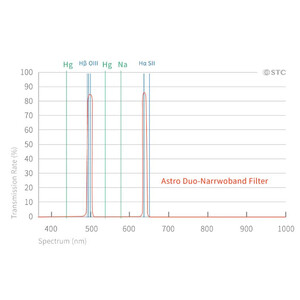 Los filtros de banda estrecha consiguen un aumento del contraste al dejar pasar solo un determinado rango de longitudes de onda de luz en las líneas espectrales de hidrógeno (H-a, 656 nm), oxígeno (OIII, 501 nm), azufre (SII, 672 nm), etc. Los filtros se pueden utilizar siempre para fotografiar, incluso cuando la Luna está en el cielo, o como filtro contra la contaminación lumínica en una gran ciudad. La duración del tiempo de exposición no importa: también se pueden hacer fotografías de larga exposición.