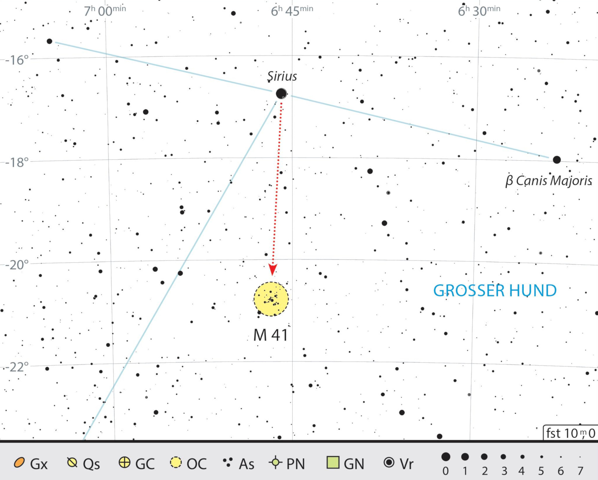 El cúmulo estelar Messier 41 en la constelación del Can Mayor captado con un telescopio Newton de 4,5" y 440 mm de distancia focal. Michael Deger / CCD GuideM41, el cúmulo estelar abierto en el Can Mayor, con un ángulo de declinación de más –20° está en el límite de lo técnicamente visible para los astrónomos de ciudad, y es que los edificios o la vegetación cercanos al emplazamiento del telescopio deben permitir una observación tan cercana al horizonte; además, la luminosidad tan intensa que se suele dar en los entornos urbanos se traga casi todos los objetos próximos a la Tierra.