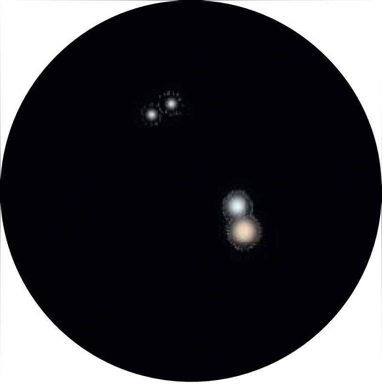 Imagen de ν Scorpii en el telescopio. D. Blaneν Scorpii es un sistema estelar cuádruple, que a menudo se suele comparar con la "doble doble" ε Lyrae. Con un factor de aumento de 25 ya podemos distinguir la primera pareja, que está formada por un componente más fuerte de magnitud 4 a una cómoda distancia de 41" de su compañera más tenue, de magnitud 6,3. Cada uno de estos componentes tiene, a su vez, sus propios acompañantes, de los que es mucho más difícil distinguirlos y cuya observación requiere una apertura considerablemente más grande.