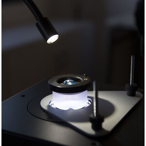The requirement for a pure white (6.3000 K), particularly high intensity light is because only incident light is seen: a flexible arm can be freely positioned and the brightness of the LED illumination accurately adjusted. LED transmitted illumination is available through a diffusing disc (for brightfield) or as a side-emitting LED ring (darkflield, with black background) only on Optigem 1 & 2. A selector gives the chance to set the microscope in 3 configurations: brightfield only, darkfield only, or both brightfield and darkfield.