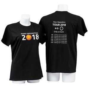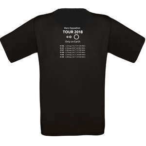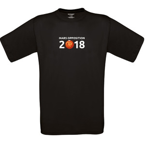 En la parte de delante, la camiseta muestra el año acompañado por una imagen de Marte. Debajo se lee "Marsopposition" (oposición de Marte). En la parte trasera aparecen las "fechas del tour" del planeta rojo. ¿Cuándo presentará determinados tamaños? ¿A qué distancia estará? ¿Cómo de luminoso se verá? Y es que la espalda puede ser un gran panel informativo. Y no necesariamente de una banda de rock... Este año hay otro gran evento a la vista: la oposición de Marte 2018. ¡El rock 'n' roll de la astronomía!