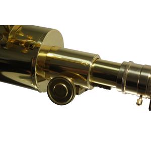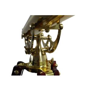 Montura y trípode: la clásica montura azimutal de latón permite girar el telescopio en vertical y en horizontal. Está montada sobre un trípode de madera de caoba de peso medio. Para evitar que se abra, el trípode está equipado con tirantes de latón y una placa de apoyo.