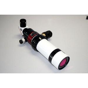 Este completo telescopio solar es un acromático de gran calidad. Su lente frontal reduce la cantidad de luz residual a la mitad (en comparación con acromáticos normales). También elimina el posible coma, astigmatismo, distorsiones en el centrado para crear, junto con las lentes colimadoras necesarias, un telescopio solar flat-field esféricamente corregido. La imagen se aprecia con una resolución extremadamente alta en la zona roja del espectro. El sistema óptico está libre de sombreado (libre de sombreado central) y es ideal para observar la superficie solar y sus protuberancias. El tubo es metalizado y de color blanco.