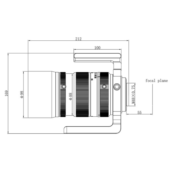 - El Apo tiene una rosca de conexión M48x0,75 en el lado de la cámara con una distancia de trabajo de 55 milímetros hasta la cámara. Esto le permite conectar todas las cámaras habituales con el anillo en T adecuado.