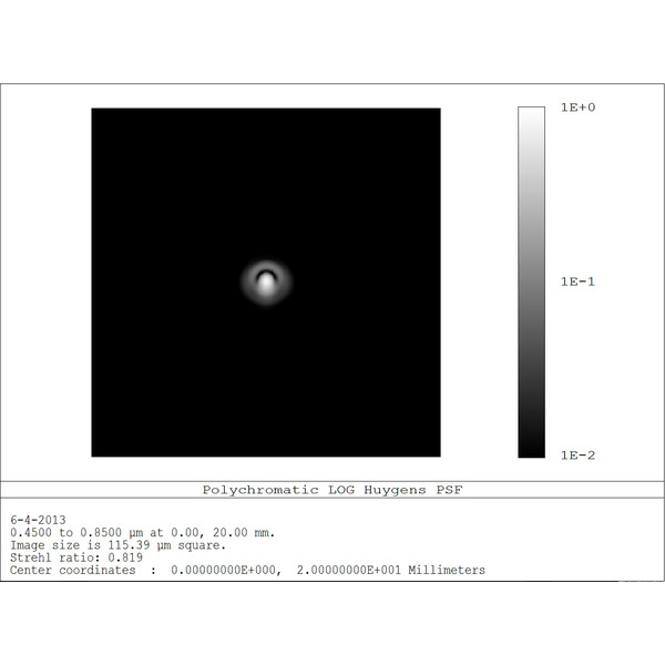 Optical system: The 300mm MDDK is a modified Dall-Kirkham design, with focal length of 1800mm (f/6) which we feel is just right. It gives the high light collection capabilities typical to a large aperture catadioptic system but without the long focal length and the focal length of a more typical newtonian but with far superior optical performance. The MDDK is telescope that is meant to be trouble free and a high performance telescope that just works. The primary and secondary mirrors are made of Supremax (SCHOTT, Germany), while the corrector lenses are high performance BBAR-coated BK7 glass. The following test results are directly from the prototype astrograph, each set of mirrors and lenses are hand figured and will be better or at least equal to this original astrograph prototype. Certification will be provided with each unique astrograph.
