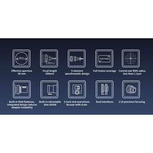 - Óptica Flatfield integrada: logra una corrección de imagen de formato completo sin viñeteado, sin distorsión y con estrellas redondas y nítidas.