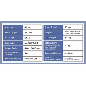 - Rapida relación de apertura de f/4,66: alta capacidad de recogida de luz para capturar objetos del cielo profundo de campo amplio, que permiten ver los detalles incluso con tiempos de exposición cortos.