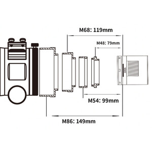 Diseño autoaplanador No necesita ningún aplanador adicional (nivelador de campo). Tampoco es necesario mantener un backfocus específico. Puede conectar cualquier accesorio que desee, siempre que entre en el foco. Para la observación visual, dispone de una longitud focal de 120 mm para espejos zenitales u otros accesorios.