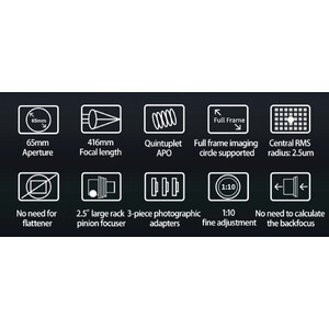 En lugar de comprar aplanadores adicionales, calcular el backfocus del aplanador o ajustar la distancia correcta, puede equipar fácilmente este apocromático con diferentes accesorios fotográficos, mantener el objeto enfocado y todo el sistema óptico estará perfectamente ajustado para la toma.