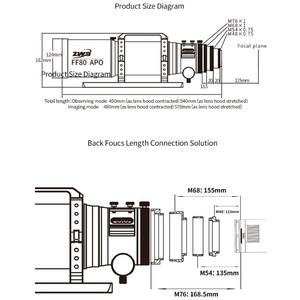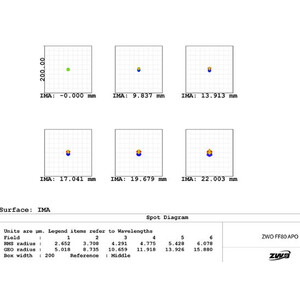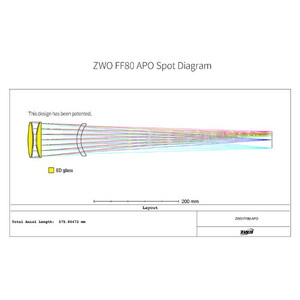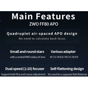 El ZWO FF80 Quadruplet es un refractor apocromático muy compacto para astrofotografía con un campo de imagen corregido hasta el formato completo y observación hasta el rango de aumento más alto. El telescopio tiene una relación de apertura de f/7,5 con una distancia focal de 600 mm. El FF80 tiene un diseño cuádruple con dos lentes ED, lo que permite una excelente supresión de la aberración cromática.