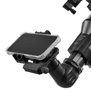 Quizás la parte más emocionante del juego de accesorios sea el adaptador de smartphone. Con él, puede fijar su propio teléfono móvil directamente al ocular y tomar fotos de lo que está observando. Capture los paisajes craterizados de la Luna o fotografíe Júpiter con sus lunas. El control obturador Bluetooth incluido garantiza imágenes sin vibraciones. Comparta su fascinación por el cielo estrellado con su familia y amigos. Más fácil, imposible.